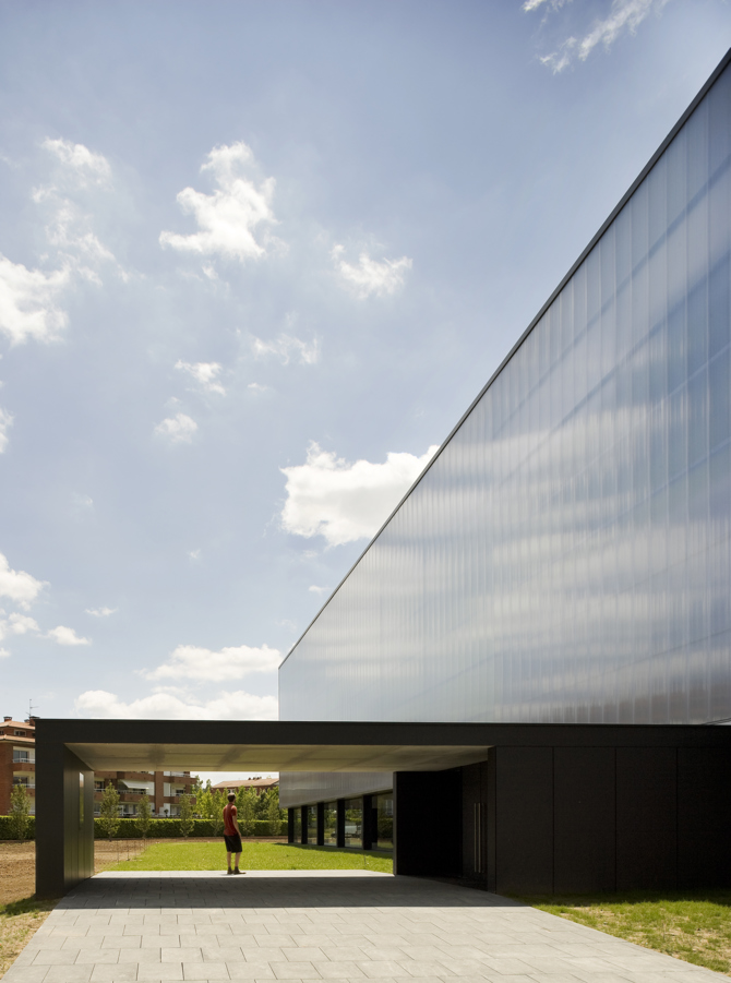 El nuevo pabellón deportivo se construye como un volumen que levita sobre el terreno. El cuerpo adquiere una geometría clara y rotunda. Gracias a ello se obtiene la posibilidad de utilizar el espacio sobre el cuerpo de vestuarios para actividades deportivas de pequeño formato (tenis de mesa) y para espacios de instalaciones y servicios. La cubierta, escalonada con el ritmo de las jácenas, ilumina un gran espacio interior blanco.