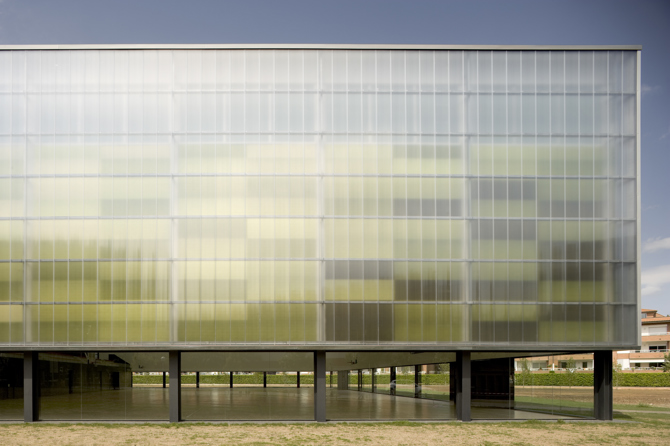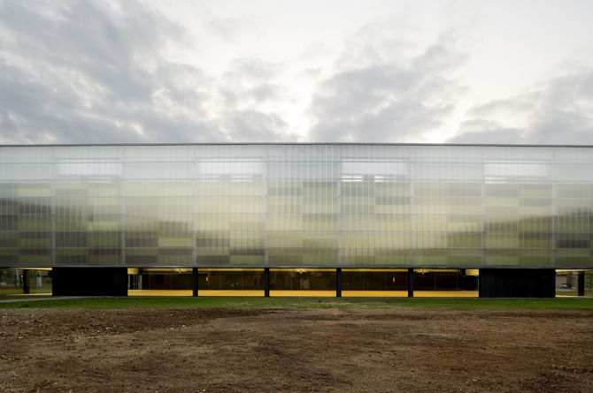 El volumen principal queda alzado a unos pocos metros del suelo, liberando una planta baja totalmente acristalada, de forma que es posible practicar deporte en el interior con vistas permanentes hacia el exterior.