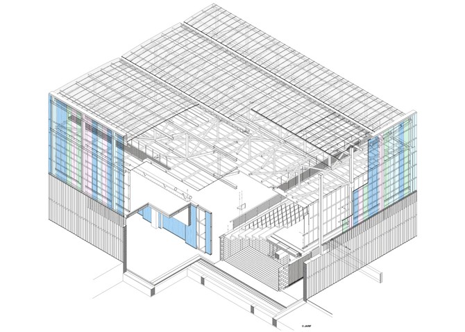 Trasladamos esta concepción al pabellón, generando una burbuja de aire limitada por una doble piel de policarbonato que se extiende por paredes y cubierta. Este muro equipado ventila de forma natural mediante rasgaduras en la piel para acondicionar térmicamente el interior sin necesidad de climatización artificial, además de alojar en su cámara toda la estructura metálica y las instalaciones eléctricas y de iluminación, evacuación de agua, extinción... Con espacio sufiente que garantiza su mantenimiento.