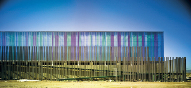 Durante el día el volumen se interpreta como una caja de colores con ciertos reflejos del entorno, según el punto de vista, gracias a la disposición de la cara de color en la parte interna del policarbonato exterior, lo que aporta un cierto efecto de profundidad a la piel. Con la puesta de sol, la gama de color empleada (magenta, verde-agua, azul cálido e intenso) desmaterializa el volumen al camuflarse con la tonalidad del cielo.