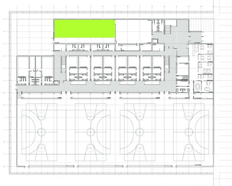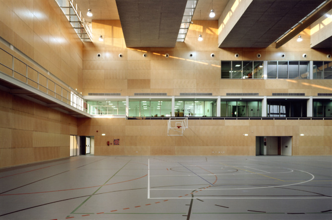Las dimensiones de la parcela, su situación dentro del conjunto del campus y las condiciones del programa de necesidades planteado, han incidido decisivamente en la organización del pabellón polideportivo y en su implantación, haciendo que una planta baja en extensión, albergue la mayor parte del programa.