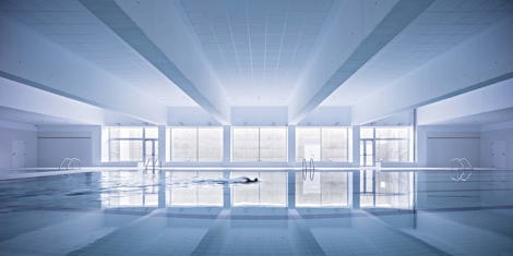 La estructura del pabellón se plantea en acero: una retícula de pilares y vigas en fachadas y cerchas para resolver las grandes luces de cubierta. El resto de la estructura será de hormigón armado, con la singularidad de vigas de gran canto sobre el espacio de las piscinas sobre las que se apean los soportes del aulario.