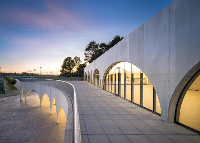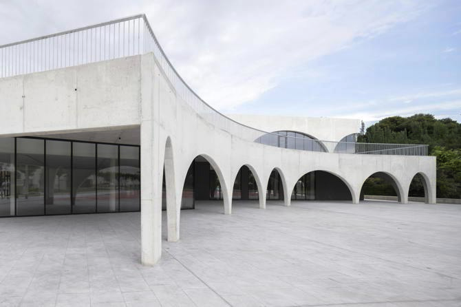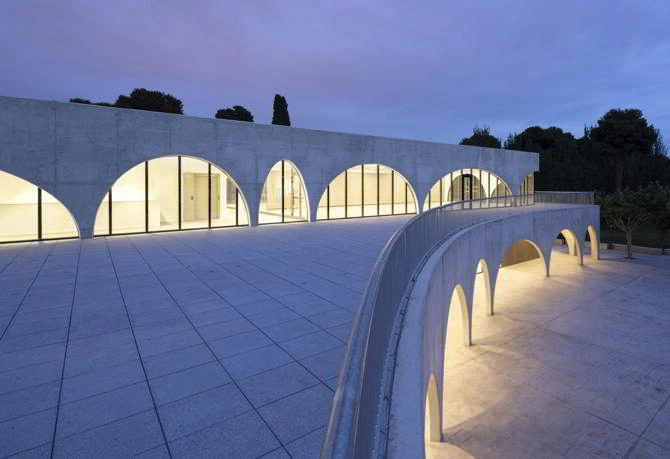 El proyecto explora la idea de pabellón rodeado de zonas verdes, como punto de encuentro de la vida social del centro. La propuesta formal materializa el trazado de las sendas y los caminos, que dibujan el movimiento de los usuarios. Las aperturas en forma de arco evocan referencialmente las fachadas del edificio originario. El despliegue de los muros de hormigón armado conforman una logia exterior que entronca con los diferentes recorridos y aproximaciones desde cada orientación, invitando a los usuarios a pasar, y propiciando el encuentro. Este espacio intersticial se convierte en el protagonista del proyecto, una estancia exterior cubierta que envuelve el espacio principal de la cafetería.