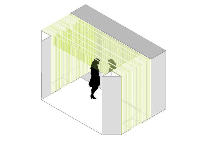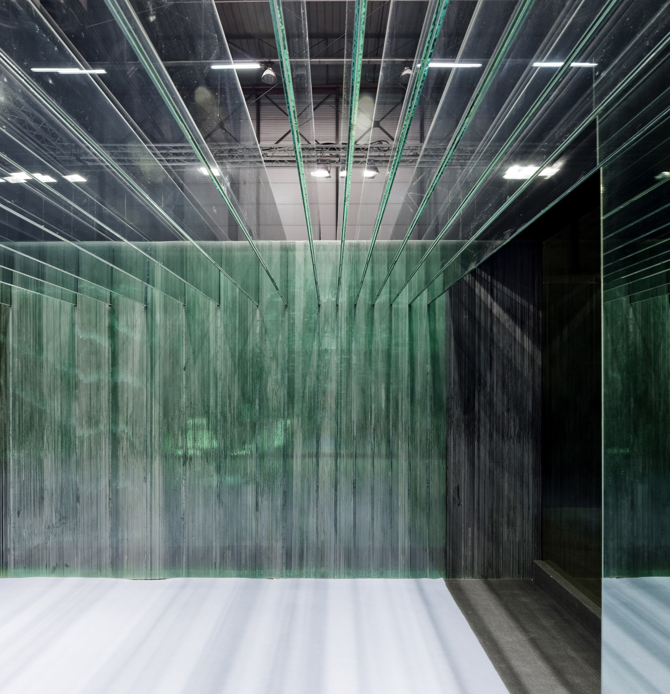 El pabellón surge a partir de una idea constructiva sencilla, casi primitiva. Una operación básica de apilamiento lateralque no debe ser considerada como un detalle. Se establece una alteración en el sistema de colocación y comprensión del vidrio como material plano, sin espesor, transparente y con reflejos por la de un material pesado, grueso y una transparencia distorsionada.