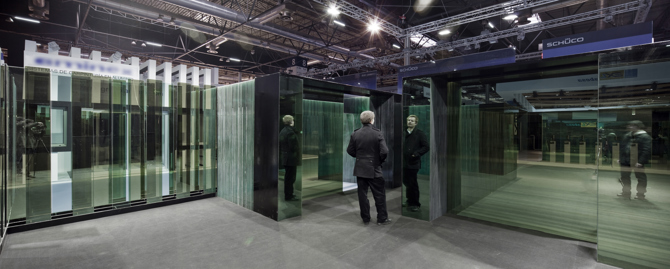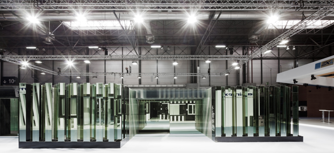 El exterior del pabellónes un prisma de geometría precisa, ortogonal y plana, mientras que el interior es un espacio amorfo*, al modo de la estructura molecular del vidrio, plano y perfecto en su exterior pero irregular y heterogéneo en su interior.