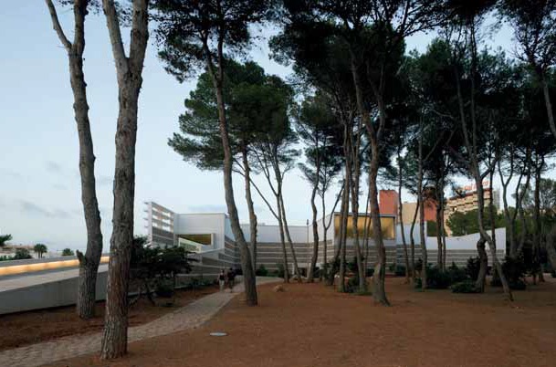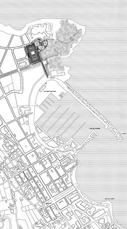 La magnífica parcela donde se ubica, junto al mar, al final de la bahía y abierta a un bosque autóctono de pinos, responde en su parte rectangular al futuro auditorio, donde se mantiene una continuidad con el trazado urbano pese a reivindicar un jardín propio; la parte ahora construida se adhiere al edificio principal y se introduce en el bosque de pinos con la libertad de querer formar parte del lugar, prolongando hacia el exterior las actividades de los congresos.