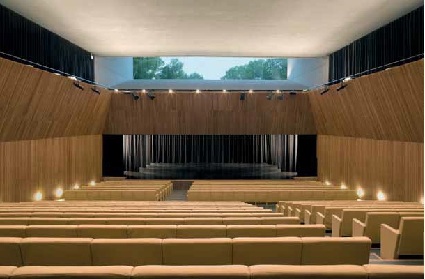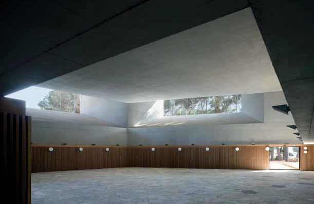 Tiene, por lo tanto, esta primera fase una estrecha relación con el entorno: su volumetría fragmentada se abre al bosque manifestando sus diferentes usos, se disuelve entre la sombre de los árboles, y se inserta en el terreno, entre muros de contención y la gruesa capa vegetal que lo cubre. Tres elementos emergen de su cubierta y expresan los espacios de ensayo y escena. Un gran volumen de planta cuadrada en torno a un patio alberga el resto del programa: las aulas, los espacios para seminarios y la futura cafetería-restaurante.