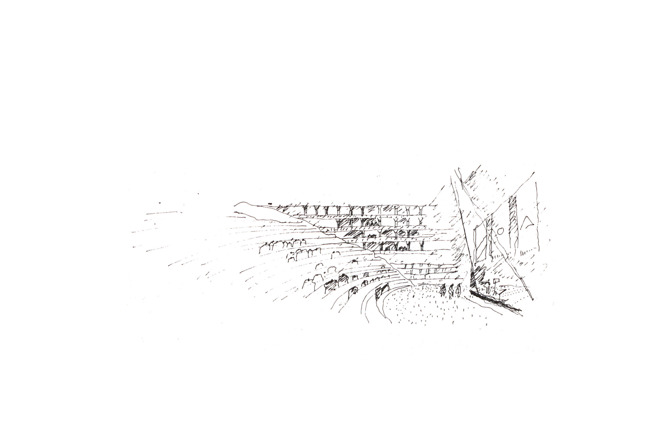 Hermosa la ciudad de Santander y hermosa la idea de un palacio sobre el mar, más que un problema técnico, un importante problema cultural: un reto a la arquitectura. A nuestra mente acude la lonja de Palma, el parlamento británico y aun la ópera de Sidney. Hitos cargados de significación que fecundan desde la ribera las culturas. Situar el edificio frente a la bahía: la clave del problema. Nos apoyamos en la ladera y penetramos ascendiendo desde la escena como en Epidauro: ¡Oh, Epidauro! Anclar la forma en la bahía, hacerla permanecer ahí, clavada para siempre, referida a sus cuatro esquinas, como los cuatro vientos: cuatro hitos de permanencia y estabilidad. Entre las cuatro señales, la cubierta, que, como sala, desciende en cascada cristalina de vidrio y metal hasta la base, la lonja de entrada. Esta se eleva seis metros sobre el horizonte, dominando la incomparable bahía en los descansos: Pedreña, al fondo. Por uno de sus laterales se desciende a las menores, que mantienen por suelo el nivel actual del terreno. La luz exterior penetra en la sala, difusa, de lo alto, quebrándose en mil inflexiones para recogerse en un interior cerrado e íntimo, también monumental (caja de 40 X 40 m).