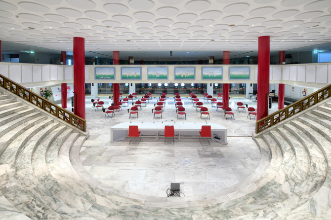 Como texturas el hormigón armado coloreado y los mármoles, en listados, como en Siena o en Loos. Capacidad prevista de la sala para más de 1 900 espectadores, las menores, podrían ampliarse, de convenir, hasta llenar gran parte de la lonja.