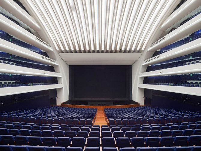 Los diferentes volúmenes del edificio se apilan entre cubiertas horizontales de paseo, que sobresalen del lateral de la estructura. El núcleo central está ocupado por el auditorio principal, totalmente climatizado, que se encuentra dentro de una carcasa con forma acústica incrustada en el conjunto. En el núcleo central también se encuentran el módulo de escenografía y los mecanismos de elevación del auditorio principal, cuyo escenario mide 1.500 m2. Para las zonas de actuación abiertas, el techo y los muros que delimitan el complejo tienen una función acústica, mientras que sobre la sala de música de cámara hay una zona de ensayo aislada y cubierta de cristal.