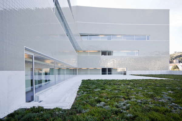 Solo en el interior de la “L” es diferente el recubrimiento, con azulejo de fabricación semiartesanal que, con su textura multiplica los matices y reflejos: “Se abren a la ría y al verde de la ladera a norte tres cuerpos en constante vibración. La materia de cada uno de ellos envía a los otros y al paisaje renovados reflejos: titanio del Guggenheim, vidrio de la biblioteca, azulejo del paraninfo”.