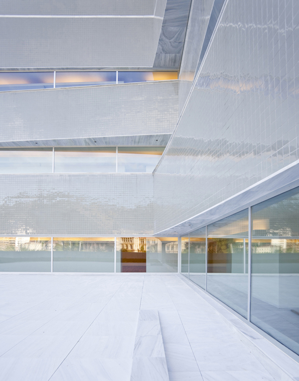 El edificio tiene una volumetría rotunda, todo recubierto de mármol Macael, y con los recortes de huecos bien delimitados.