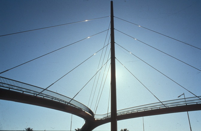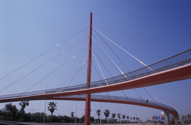 La pasarela se hizo para comunicar tres puntos separados por dos vías de tráfico; la forma de “Y” en planta se debe a que una de las comunicaciones entre los tres puntos es de menor importancia que las otras dos. Por ello la pasarela tiene un brazo principal recto que se bifurca en dos ramales curvos. El atirantamiento se hace desde una sola torre, situada cerca de la intersección de los tres brazos, de la que parten tres familias de tirantes, una para cada brazo; el principal se atiranta en su eje y los secundarios en un borde.