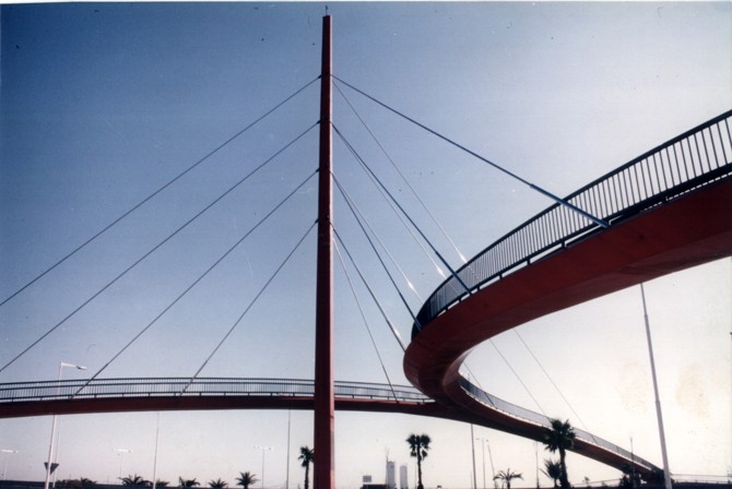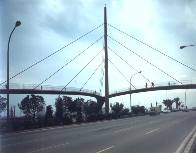 La pasarela de las Glorias Catalanas es la primera obra atirantada que hemos hecho y la segunda española (la primera fue el Puente de la Salve, sobre el río Nervión en Bilbao). Esta pasarela se ha proyectado dos veces, porque con motivo de la remodelación de la Plaza de las Glorias Catalanas para los Juegos Olímpicos de 1992 fue necesario trasladarla desde dicha plaza al cinturón litoral de Barcelona.
