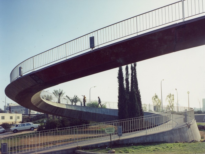 La estructura atirantada es metálica y se remata con accesos de hormigón en los tres extremos. Uno de ellos es un caracol en voladizo, otro un pequeño voladizo recto y el tercero es un segundo caracol apoyado en la pila extrema del tramo metálico. Se terminó en 1974.