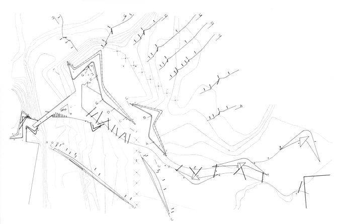 Iniciamos el recorrido con la mirada hacia las montañas. A medio camino, sobre la plaza, nos dirigiremos hacia el pueblo. No queremos hacer de la zona un espacio urbano, más bien manchar el territorio para apropiarnos de él de forma más sutil.