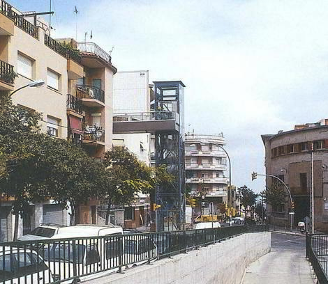 La estructura de las pasarelas como de los ascensores se resuelve con perfilería metálica, y allí donde la luz a salvar por la pasarela es muy grande, se utilizan pilares circulares de gran dimensión. Las barandillas y los cerramientos de vidrio utilizados evitan que se produzca una sensación de colmatado del espacio de la calle.