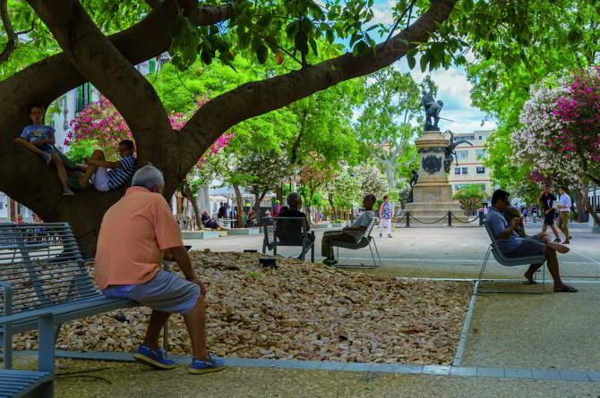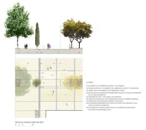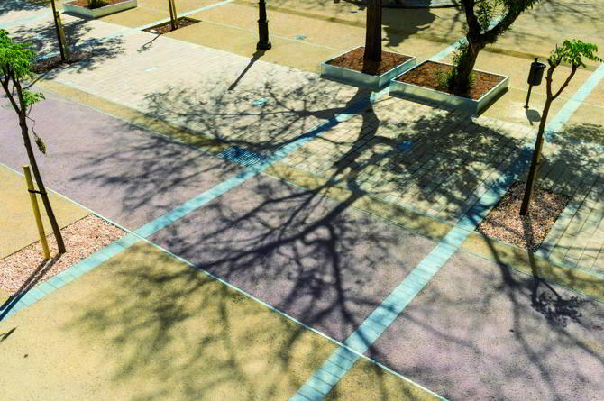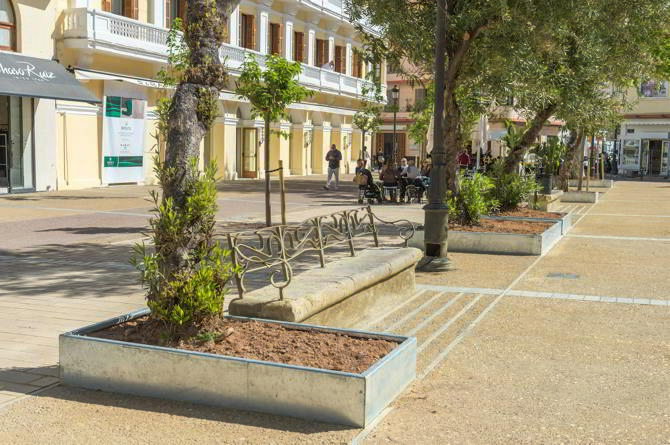 Se reciclan no solo los bordillos, sino también las farolas y el mobiliario urbano –bancos de piedra históricos y otros muebles. Se mantiene toda la vegetación, y en especial, los ejemplares monumentales. La estrategia de reciclaje va más allá de la conciencia medioambiental para ser parte de un nuevo paradigma económico. En 2010, el presupuesto para urbanizar espacios peatonales se había reducido a la mitad. El vocabulario estándar de losas de piedra -costosamente acarreadas en barco desde la península- y la renovación completa de farolas y mobiliario ya no era viable. Necesitábamos inventar otro vocabulario que, con la misma o mejor calidad y durabilidad, nos permitiera reducir el coste de 300 euros/m2 a 180 euro/m2, un 60%. Dado que el impacto de las infraestructuras es difícilmente reducible, el pavimento era la parte principal de la urbanización para absorber esta masiva reducción de coste.