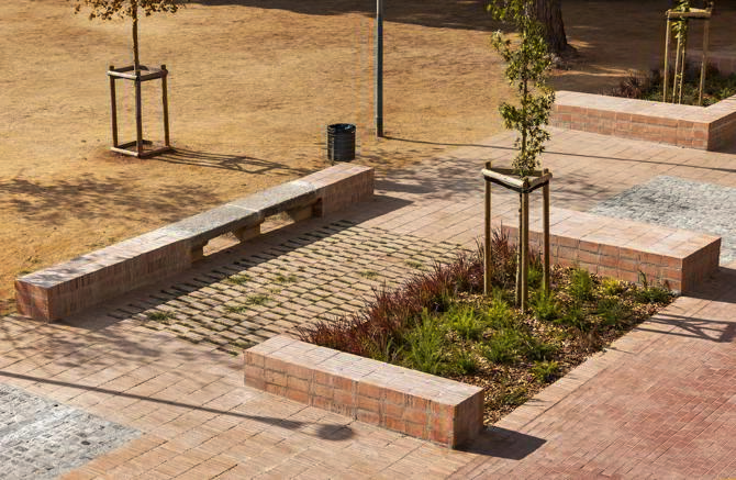 El proyecto incorpora elementos patrimoniales, como una antigua fuente convertida en parterre, algunos bancos de piedra recuperados de los jardines o el pavimento de adoquín oculto bajo el asfalto durante décadas, recolocado formando “alfombras” en los espacios domésticos de la franja de transición.