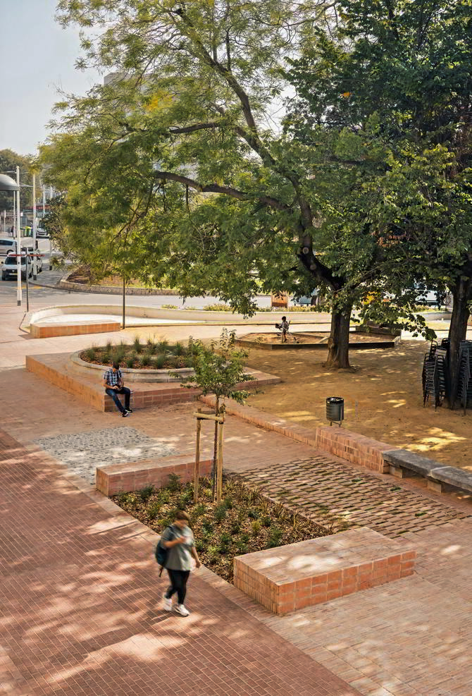 Se renaturaliza el espacio público con arbolado y vegetación de estratos medios y bajos de follaje y floración rojiza, dando continuidad a la materialidad dominante del proyecto, y se incrementan las superficies filtrantes (un 25% de la superficie de la franja de transición), contribuyendo a restaurar el ciclo natural del agua y mejorar el nivel de los acuíferos.