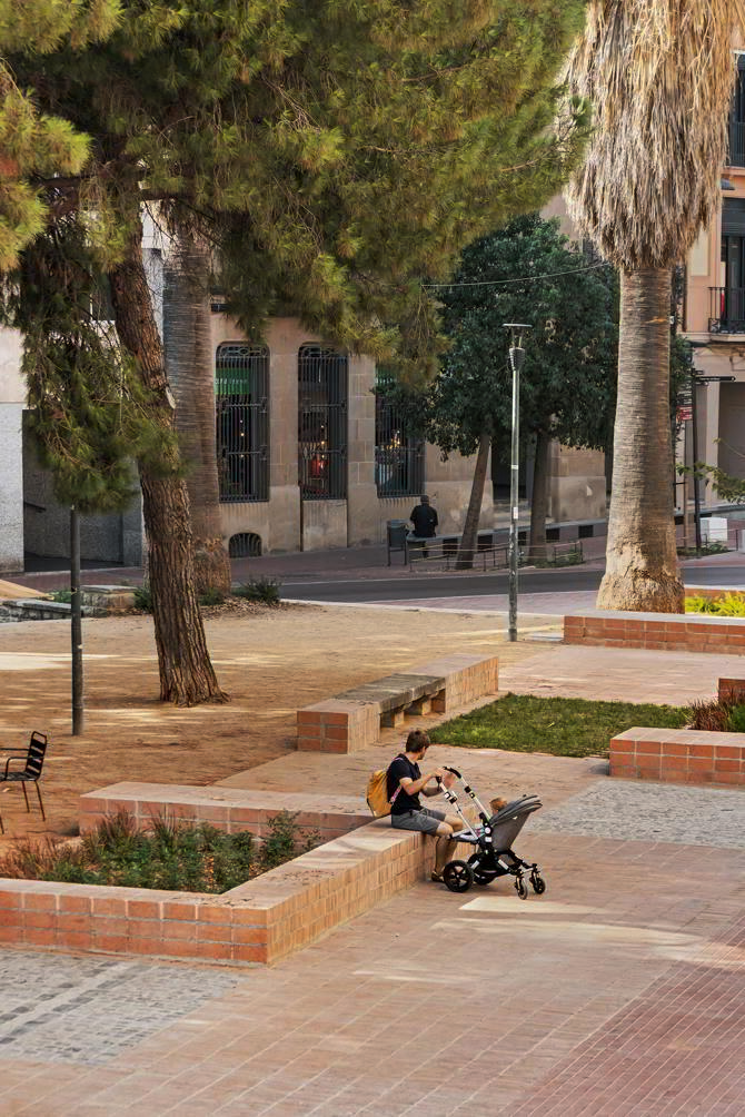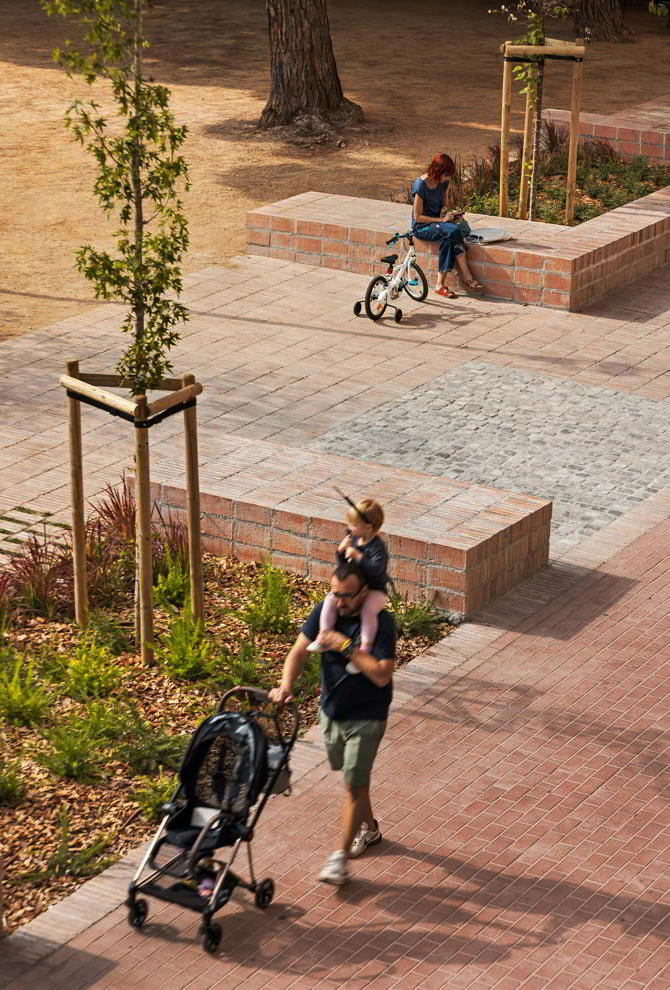 El resultado es una "calle-plaza" dividida en dos franjas. Una, de circulación, con prioridad peatonal. Otra, de transición entre la calle y los jardines, formada por parterres y bancos dispuestos con el objetivo de romper la linealidad de la calle y formar espacios de socialización (conversar, descansar, jugar...) de una escala acotada, casi doméstica.