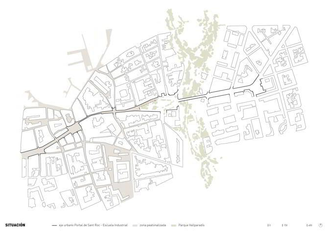 El proyecto se sitúa en uno de los principales ejes urbanos de Terrassa, entre el Portal de Sant Roc y la Escuela Industrial, en un tramo de calle de unos 125m de largo y 15 de ancho, de sección asimétrica, con una fachada consolidada a norte y unos jardines públicos a sur. La transformación, integrada en el proyecto de ampliación de la zona peatonal del centro urbano, tiene como principales objetivos la pacificación del tráfico, la mejora de la conectividad con los jardines y la introducción de áreas para la socialización vecinal.