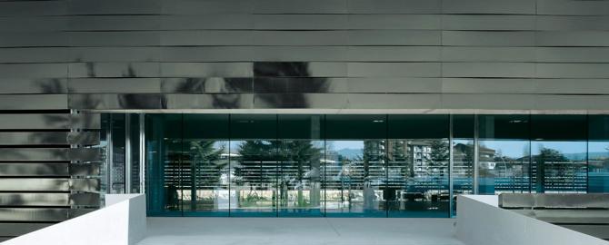 La rampa de acceso, el porche frontal, la entrada lateral, la definición de la fachada, los vasos desbordantes, el gimnasio altivo, las transparencias filtradas, los vestuarios tres el patio transversal, las gradas frente al patio trasero, son elementos, todos ellos, que contribuyen a la configuración de una atmosfera pausada, acuosa, llena de reflejos.