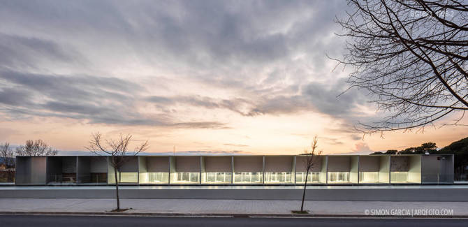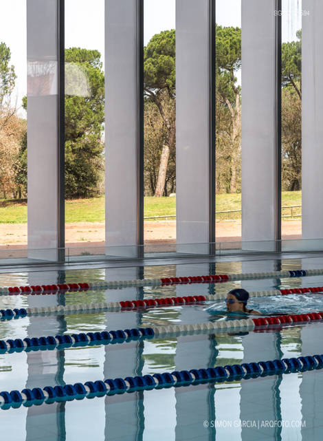 Un pequeño muro, como si de una valla se tratase, desde la calle se convierte en un gran mirador hacia el espacio de pistas, filtrado por los elementos verticales, que son estructura portante y protección solar, al mismo tiempo, de la piscina cubierta. Los vestuarios bajo la valla y los reflejos del agua recogen el espacio exterior y diluyen la presencia de los ritmados pilares, frente a la plantación de pinos, como eco de los bosques circundantes.