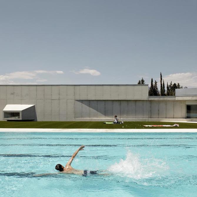 Entonces, el edificio se desarrolla linealmente, entre la carretera y las piscinas, configurando el telón de fondo del espacio de actividades exteriores y articulando los espacios de acceso en los extremos. Se exploran los límites entre interior y exterior, mediante una estructura de hormigón in situ y un sistema de fachada a base de perfiles metálicos. Entre estos dos elementos, aparecen espacios de intersticio: porches, patios, sombras..., espacios de ambigüedad que diluyen y confunden la relación entre dentro y fuera.