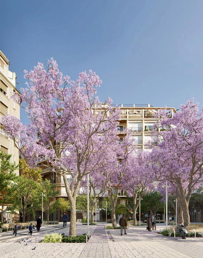 El diseño se aborda de manera radial y sistemática: una gran plataforma de piedra natural alberga en su corazón ocho jacarandas, que generan una amplia canopia central y un área de descanso. En contraste con el centro, el anillo perimetral de árboles existentes se refuerza mayoritariamente con arbustos y árboles más pequeños. Las áreas de asientos exteriores de los bares se ubi- can en esta zona. Entre el centro y este perímetro verde hay espacio para los tráficos rodados. Todo el drenaje de aguas pluviales se produce mediante bio-retención, favoreciendo el crecimiento de la vegetación para permitir más sombra, reduciendo así el efecto de isla de calor en el centro de la ciudad.