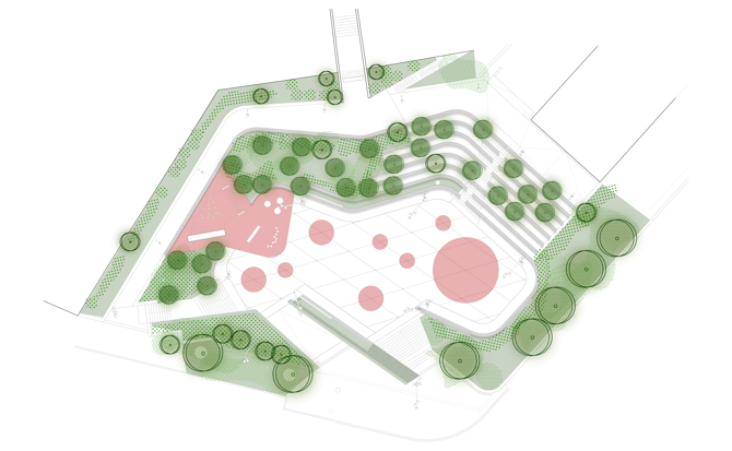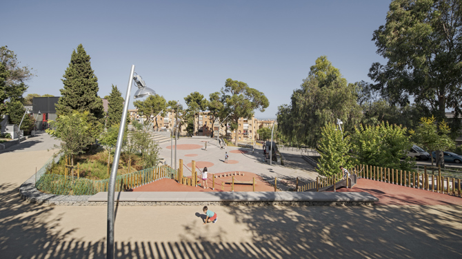 La intervención pretende convertir la plaza en un espacio de confluencia entre equipamientos, una rótula en el eje cívico y un punto de encuentro del barrio.