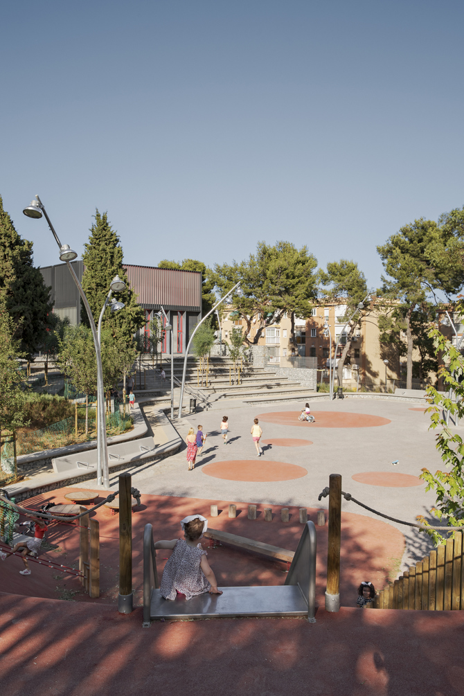 En el lado este, en relación al Ateneo popular 9Barris, unas gradas hacen que la plaza pueda eventualmente funcionar como escenario de espectáculos. En el lado oeste, en relación a la escuela Antaviana, una zona de juegos infantiles aprovecha el talud vegetal como espacio lúdico.