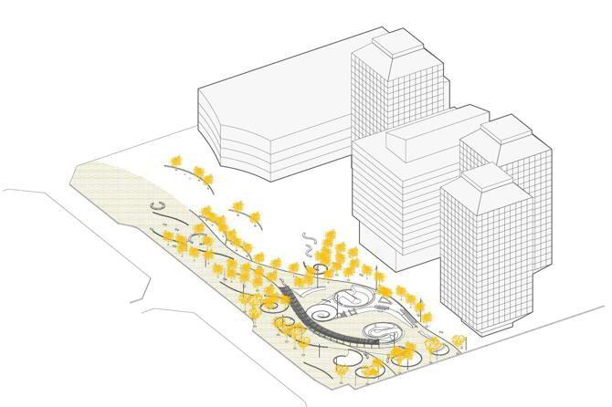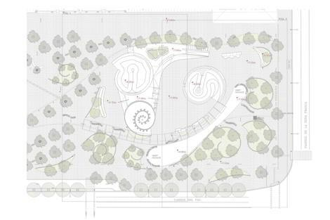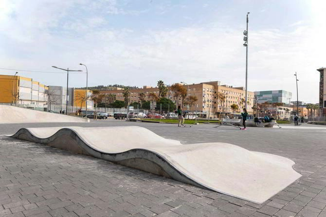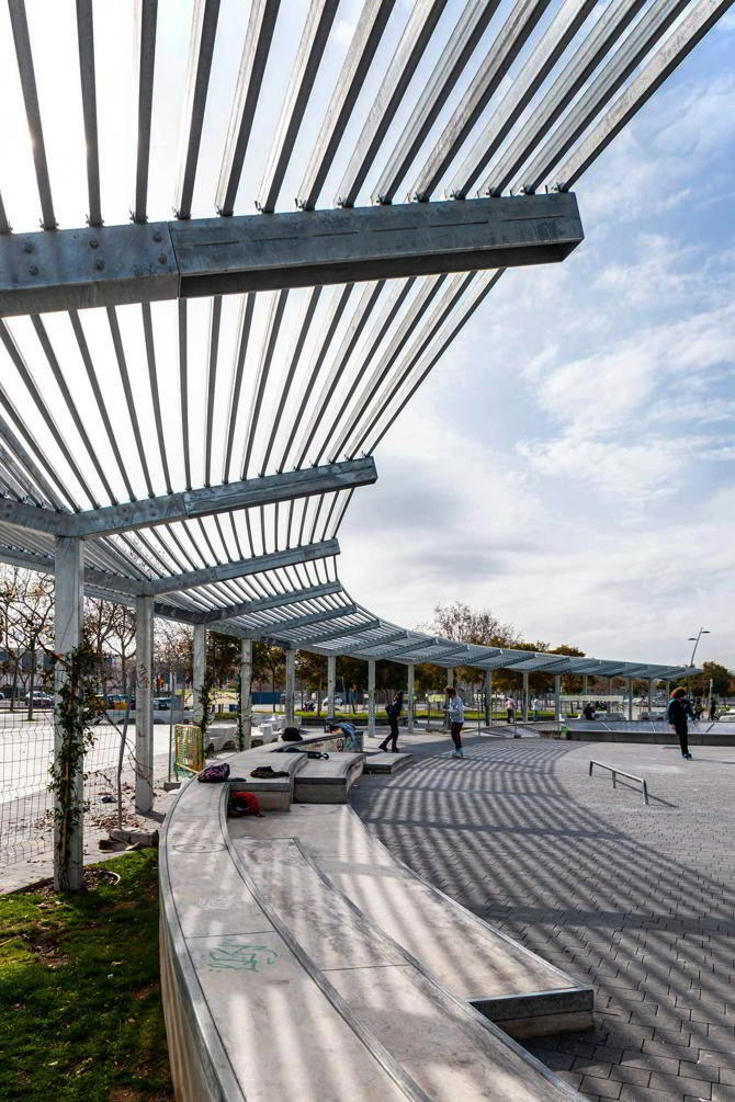 El resultado es una relectura del diseño de Toyo Ito Associates que conserva sus trazas principales y las reinterpreta mediante operaciones de mínima intervención. Los parterres perimetrales se redibujan siguiendo las geometrías existentes, desplazando unos pocos para crear una zona central dedicada a la práctica de deportes urbanos. Dos de ellos se transforman en “bowls” patinables, conectados entre sí por rampas y planos derivados de los mismos vectores del proyecto inicial. Esta nueva capa de uso se integra de forma natural en el conjunto, sin perder coherencia formal.