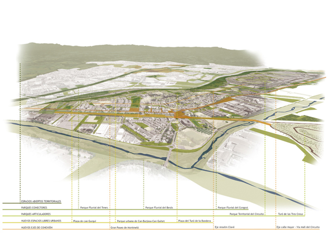 El plan fundamenta las soluciones de planeamiento en dos acciones simultáneas y complementarias: rearticular el mosaico territorial de la geografía de ríos y pequeños valles. En primer lugar, el reto de la ciudad es superar la barreras de las infraestructuras que actualmente dividen y aíslan el núcleo urbano, y la definición de los criterios proyectuales que orienten la implantación de las futuras. Actuaciones que deben restablecer continuidades múltiples y diversas, urbanas y territoriales, concebidas como mecanismos catalizadores de un proceso de renovación territorial más amplio.
