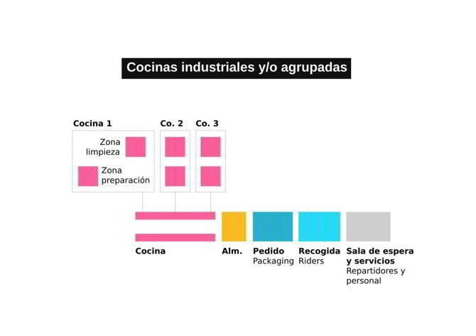 Se han generado modelos híbridos entre el plano físico y el digital que conviven con fórmulas ya establecidas, como son los espacios de preparación de platos preparados, las empresas de catering o las cocinas industriales centrales de cadenas de restaurantes, con otras actividades fruto de la economía de plataformas (como las cocinas o los supermercados fantasma).
