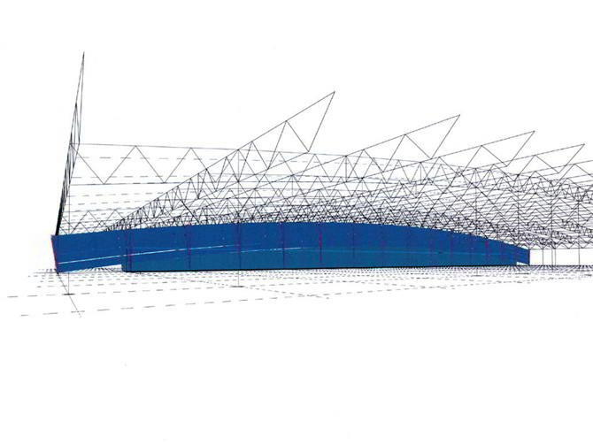 La gran cubierta arqueada acoge el complejo programa y maquinaria de la planta de residuos donde se separan y tratan los distintos tipos de basura, que quedan recogidos en el perímetro rectangular. Una organización simétrica determinada por el recorrido de la doble banda. Asimismo, se proyecta un cuerpo de dos alturas que alberga las oficinas, las salas, las aulas de trabajo y los vestuarios. Estos se conectan mediante una pasarela atirantada que dota de singularidad a este espacio. Dos grandes patios, uno ajardinado y otro de servicio, perforan la cubierta, fachada principal del proyecto, a los que se vuelcan los espacios de trabajo.