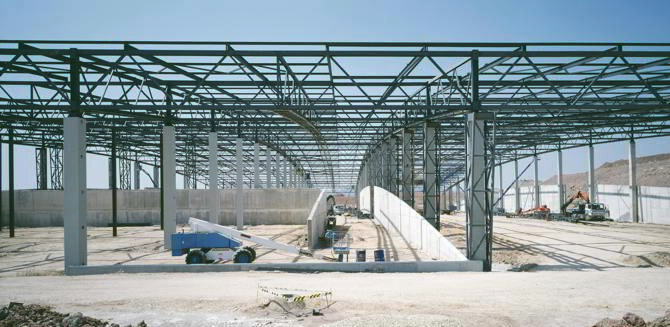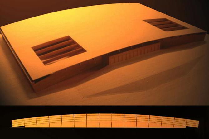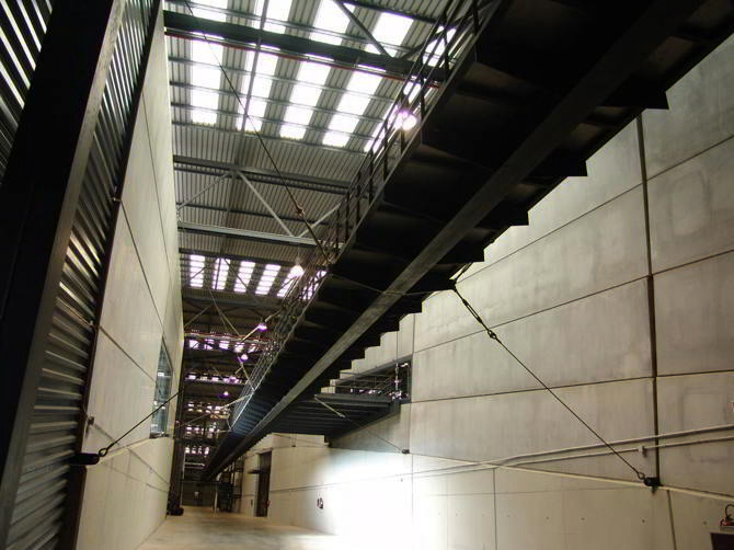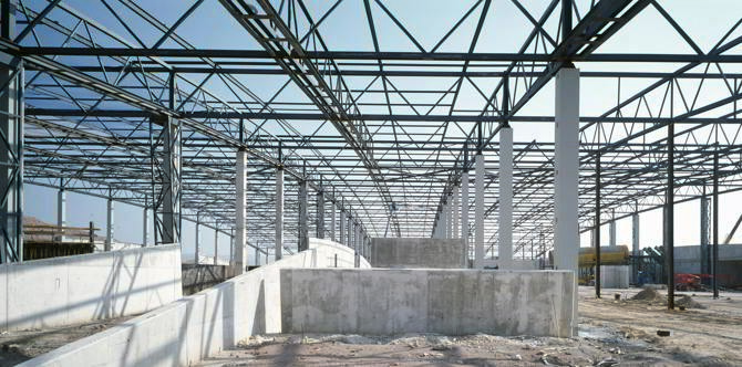 La estructura metálica de pilares y grandes cerchas curvas configuran el esqueleto, el volumen y el espacio interior. En el nivel inferior los pilares de hormigón sirven de apoyo de la estructura de acero. Los acabados de carácter industrial exhiben el armazón del proyecto con muros de separación realizados con bloque de hormigón, paneles de hormigón prefabricado y pasarelas metálicas atirantadas. Las instalaciones quedan vistas y enfatizadas por la luz natural que penetra a través de los dos patios y de los distintos lucernarios de la cubierta.