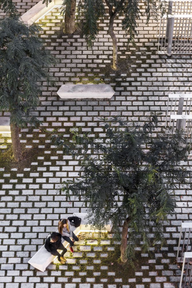 El objetivo del diseño es crear transiciones continuas de duro a verde tanto desde el punto de vista visual como físico. La transición entre el campus y el parque se basa en el gradiente de plantación de árboles que fusiona la plaza con el dosel verde del parque. Dentro de la plaza, la transición de las áreas duras a las verdes alrededor de los árboles se resuelve con gradientes en el patrón de mosaico del piso utilizando una herramienta paramétrica. En lugar de diseñar el patrón, diseñamos las reglas que impulsarán los gradientes y usamos como variables el formato de los mosaicos, las secuencias incrementales de las uniones y el tamaño y la dimensión de los campos alrededor de cada árbol que regulan las transiciones.