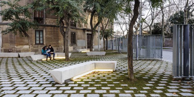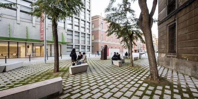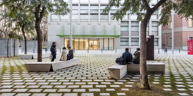 La plaza conecta física y visualmente el campus urbano de pavimento duro de la UPF con el histórico Parque de la Ciutadella. Aunque se trata principalmente de un espacio de circulación peatonal, también será una de las pocas áreas recreativas al aire libre del campus.