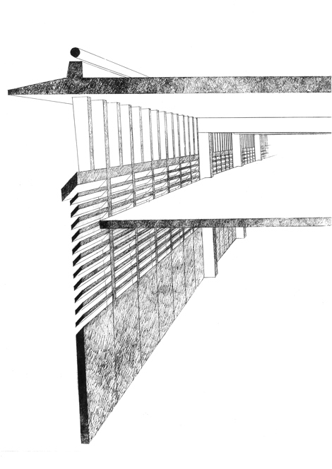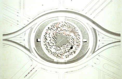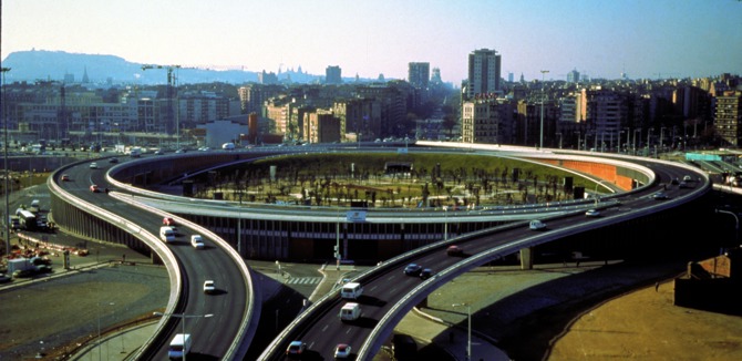La vialidad, la geometría de los trazados viarios y los automóviles fijan la escala y las dimensiones de la propuesta. Es un intercambiador de tráfico a la vez que se establece un jardín interior. Alrededor del anillo viario, un gran parque adecuaría la vialidad a nivel. El edificio circular acoge aparcamientos y el mercado de Los Encantes. Una salida de Metro en el jardín interior conecta con la comunicación básica metropolitana.