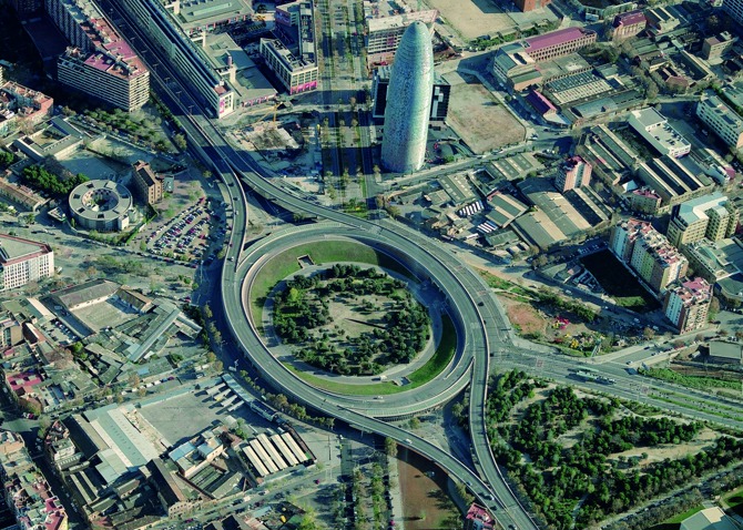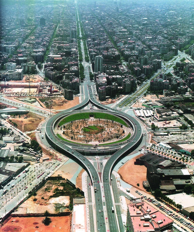 En aquel momento la plaza era un caótico nudo viario que religaba las avenidas Diagonal, Gran Vía y Meridiana con las autopistas A-17 y A-19. La caótica estructura de apoyo de los viaductos que resolvían el enlace había perdido toda señal de urbanidad y tampoco reconocía la centralidad de la plaza. La solución arquitectónica de la plaza utiliza el tráfico como material de proyecto.