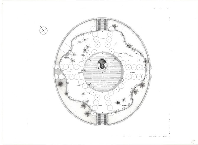 Por la parte interior de la plaza solo sobresalen los balaustres, mientras que el desnivel del murete exterior se suaviza mediante un sinuoso parterre de césped que personaliza todo el perímetro interior.