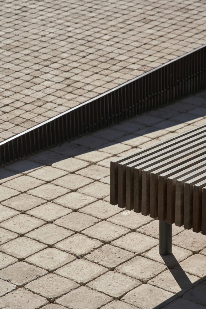 La unión entre lo nuevo y lo histórico tiene eco en su propia materialidad, combinando su forma contemporánea con materiales, texturas y colores propios del pueblo. Para ello se resuelve este espacio utilizando principalmente tres materiales: adoquines de hormigón envejecido, madera y celosías metálicas inspiradas en forjas y carpinterías tradicionales. El adoquín envejecido tiene como objetivo favorecer la relación con la muralla, el casco antiguo y la plaza mayor. El despiece se basa en dos tamaños, 8x8 y 16x16, distribuidos en la plaza en función del uso de cada zona (paso, paseo o estancia), de manera cada uso y los diferentes niveles de accesibilidad se ponen de manifiesto a través del cambio de material. La iluminación principal de la plaza al caer el sol se integra en los cortes verticales de los pliegues de la plaza, a través de cajas de luz tamizadas mediante celosías metálicas que las protegen. Se busca, además de iluminar, reforzar y señalizar los cambios de pendiente para mayor comprensión del espacio.