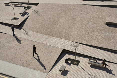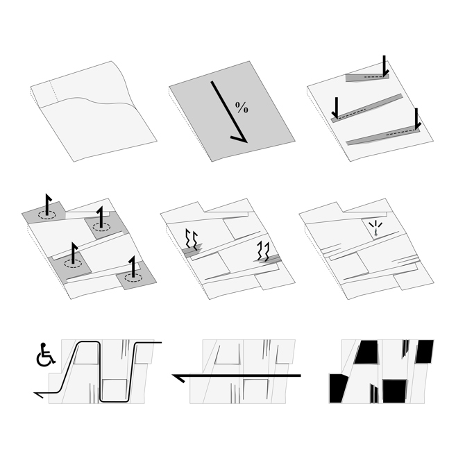 Geométricamente se reparte el desnivel de forma uniforme en toda la superficie de la plaza. Los primeros pliegues de esta superficie surgen para constituir plataformas inclinadas en zigzag que proporcionan un recorrido accesible universal entre sus dos extremos. A lo largo de este recorrido aparecen nuevos pliegues, esta vez sin pendiente, que se erigen como lugares para estar y descubrir diferentes puntos de vista y soleamiento. Estas plazas dentro de la plaza serán el lugar donde se disponga el mobiliario y la vegetación, junto con la escultura del Zarrón, que será reubicada en una de ellas desde la Plaza Mayor. Como complemento a estas plazas, otros dobleces atenúan la pendiente y generan espacios de menor escala donde poder estar, a modo de pequeños graderíos de dos escalones. Esta complejidad aparente se resuelve gracias a un exhaustivo estudio geométrico y modulación que permite su control, ejecución y optimización de recursos.