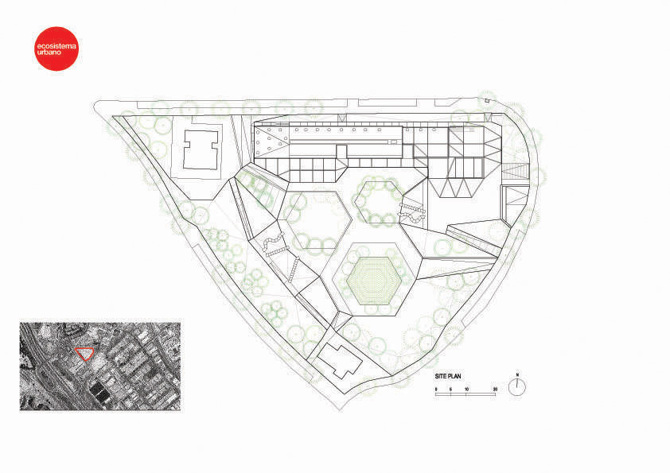 El sistema de alcantarillado desemboca en una laguna situada frente al edificio, donde todas las aguas residuales del edificio son depuradas de forma natural por plantas macrófitas. Toda el agua depurada se almacena bajo tierra dentro de un depósito de grava y se utiliza para todas las necesidades de riego de la plaza, este paisaje artificial emula una ribera natural. Se ha creado una topografía artificial como filtro de cerramiento y protección del agresivo entorno industrial, dentro de la plaza es fácil olvidarse del contexto e imaginar que se está en otro lugar, más cerca de la naturaleza.