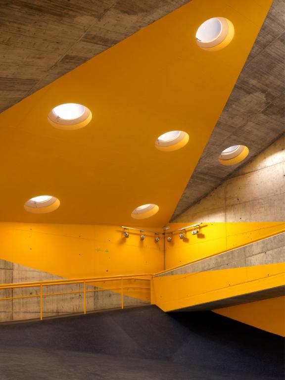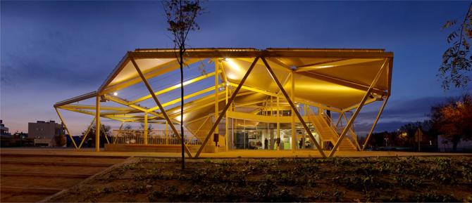 Una importante zona del edificio semienterrada (el 50% del edificio aprovecha la inercia térmica de los terrenos) y una gran fachada acristalada orientada al sur (700 m2) son decisiones básicas que configuran la relación física entre el edificio y su entorno. Una capa textil bioclimática superpuesta a una estructura ligera de acero envuelve el núcleo racional de hormigón del edificio. Este textil (parcialmente móvil, conectado con sensores a la posición del sol) es la interfaz entre los espacios interiores y exteriores, difuminando los límites entre lo privado y lo público y extendiendo el confort interior al espacio público.