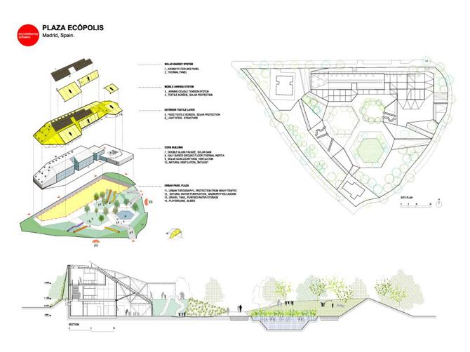 El proyecto Plaza Ecópolis pretende incorporar la idea de sostenibilidad a la vida cotidiana. Se trata, por tanto, de crear una visión de la sostenibilidad urbana que facilite la reducción del consumo de energía por cuestiones de diseño, pero que también tenga como objetivo concienciar a las personas de su propio comportamiento de consumo. La disposición del edificio genera un espacio público que puede ser utilizado por los residentes de la zona.