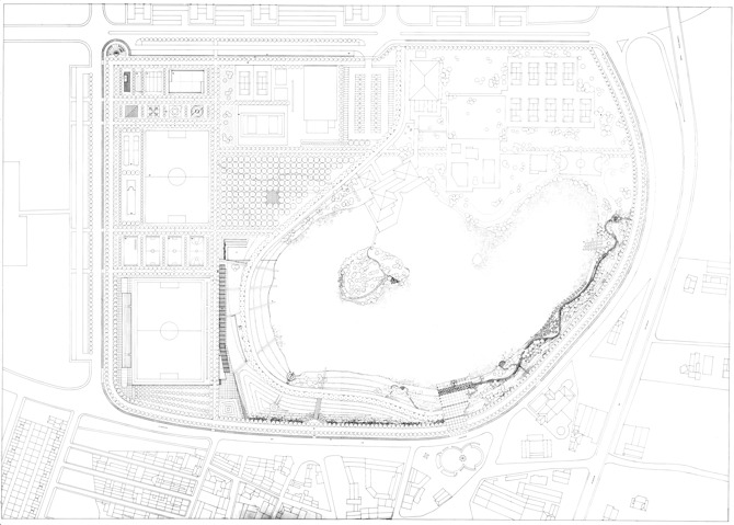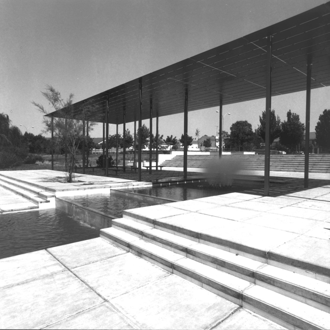 La pérgola, desde esta visión, de acceso, enmarca el lago y oculta levemente la silueta de las torres de viviendas que forma el fondo del parque. La pérgola, plano de sombra que se superpone al plano de la plaza, crea un espacio de cierta vibración en el que se proyectan los reflejos del agua de la fuente y del propio lago.