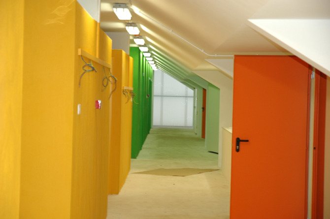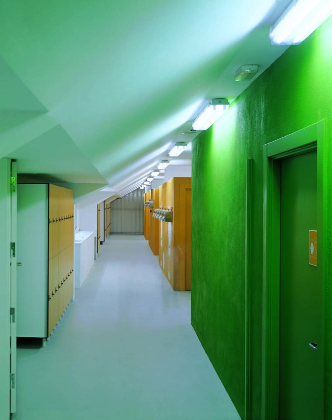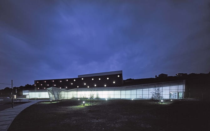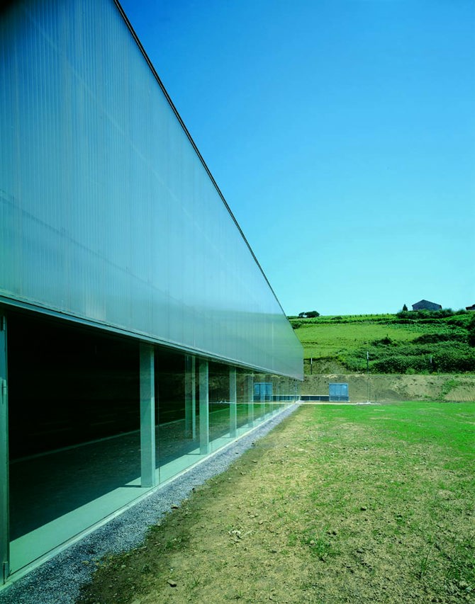 El policarbonato celular traslúcido, en las zonas perimetrales públicas, resuelve el aislamiento térmico y junto con los abedules la protección del sol del oeste, durante la noche se convierte en un faro que remata el valle. Para el volumen superior se utiliza un sistema tipo cubierta deck con un aislamiento de baja densidad y 10 cm de espesor que, anclado mecánicamente a la chapa, ofrece un aspecto de sofá tipo chéster durante el día y de cielo estrellado durante la noche gracias a la luz tamizada por las claraboyas.