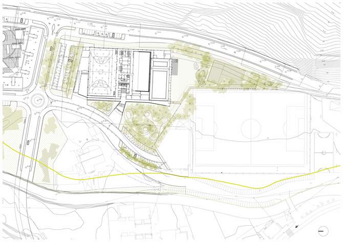 El edificio se sitúa en un pequeño e inundable valle de acceso al mar en la localidad costera de Bakio. Ocupa el lado noreste de la parcela, liberando dos zonas, una al oeste, por la que se realiza el acceso y se establece la relación del edificio con el público; y la otra, al sur, algo elevada respecto a la entrada y al campo de fútbol colindante, que se utilizará como solárium de las piscinas.